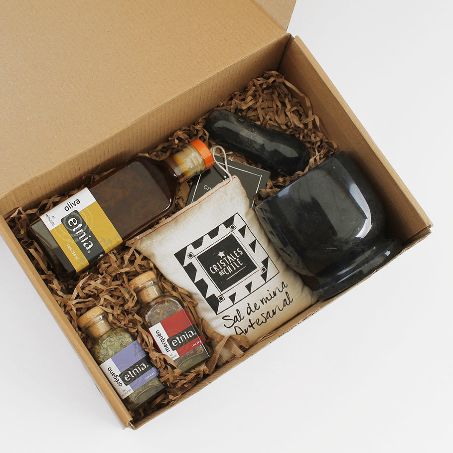 Presentado en caja kraft y tarjeta de saludo con logo corporativo