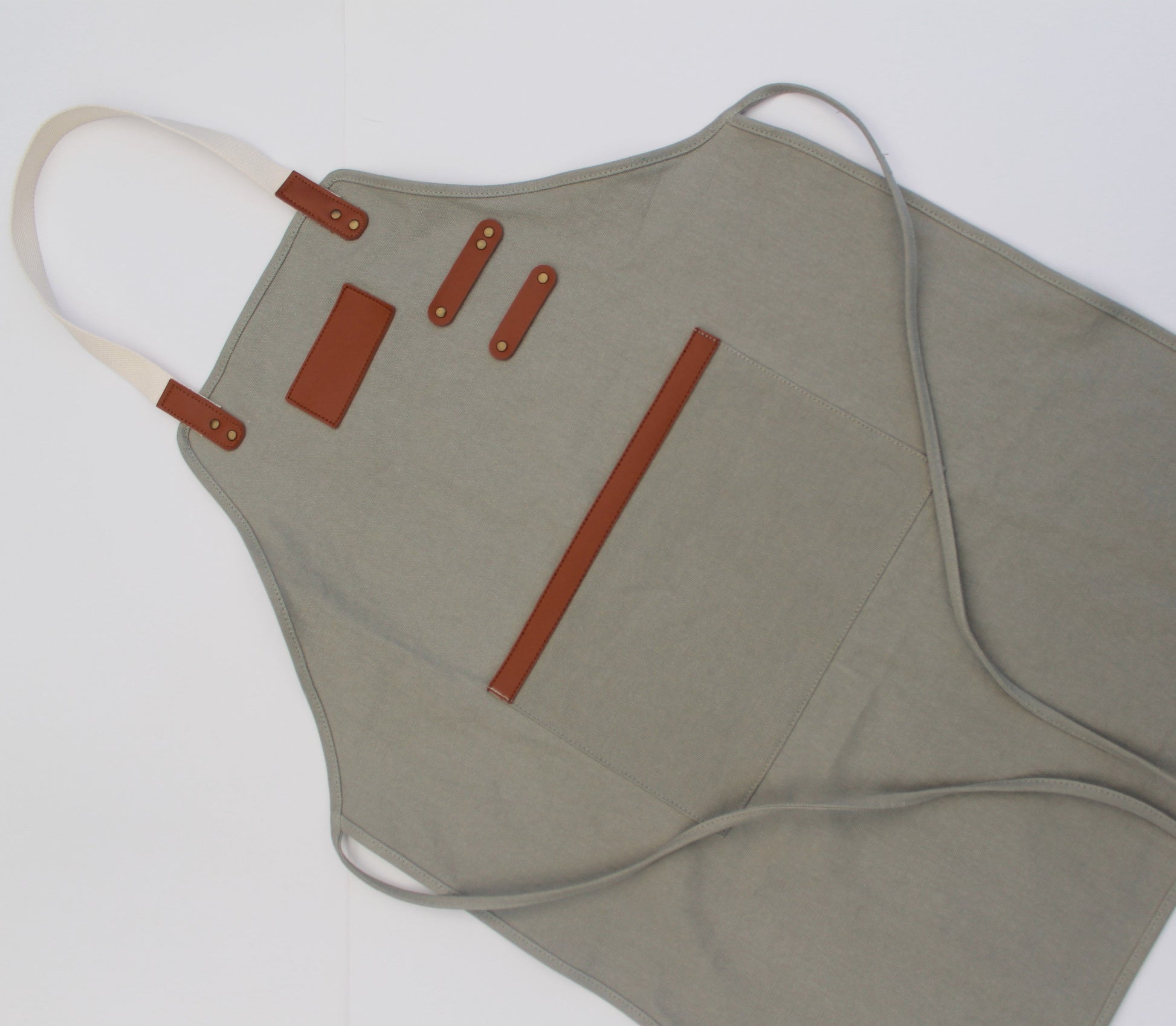 Pechera de tela canvas algodón natural, con detalles en ecocuero café y logo grabado opcional. Incluye bolsillo delantero, compartimento para cuchillo o tenazas y etiqueta cosida de eco-cuero.