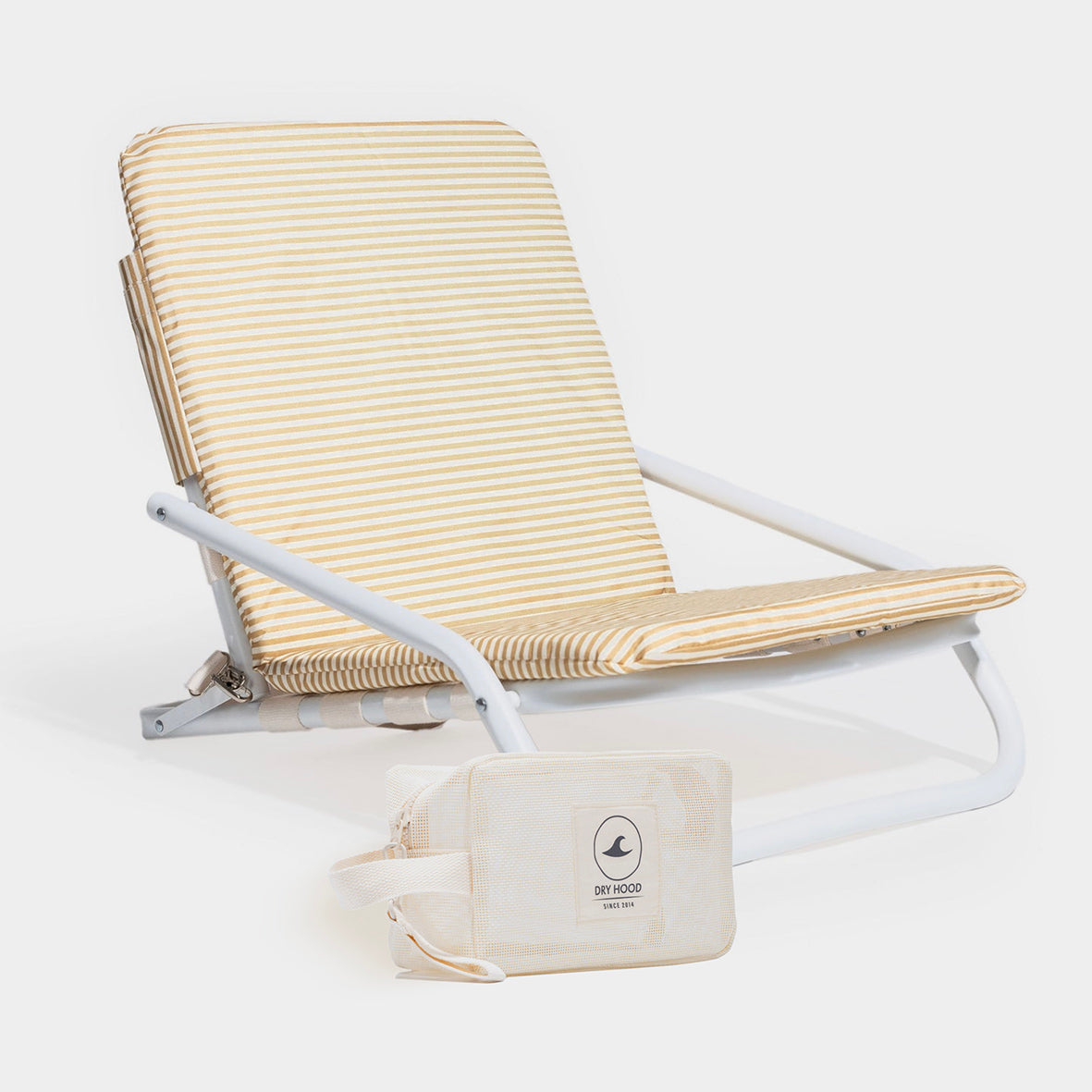 Silla playa Plegable Sunset Beige Dry Hood, balance entre comodidad y practicidad. Su liviano modelo y su correa de hombro permite que sea de fácil traslado.