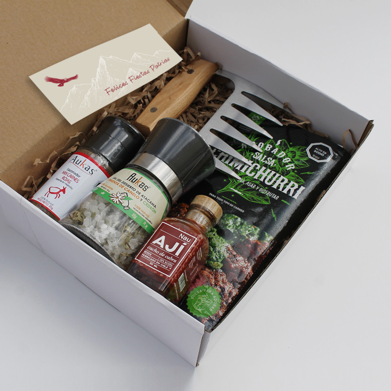 Presentado en caja con tarjeta de saludo y logo corporativo, con diseño de vuelo de cóndor u otro motivo según preferencia