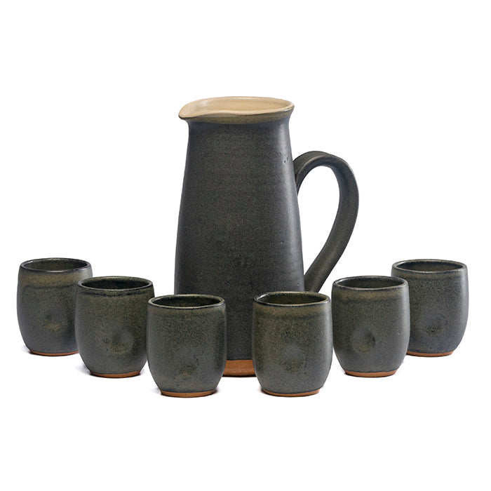 Jarra con asa y 6 vasos en cerámica gres, variedad de diseños.